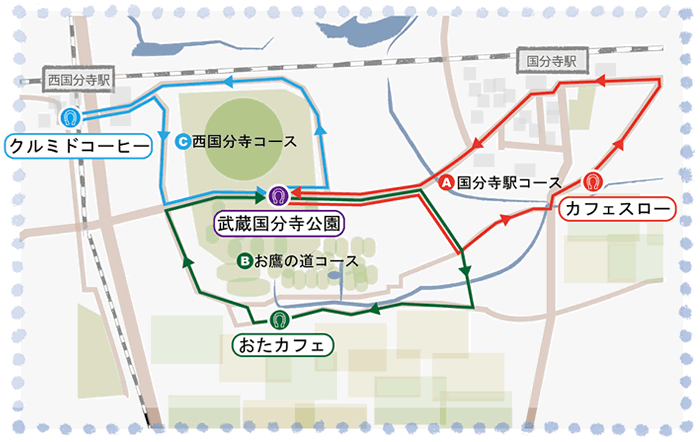 【集合場所】上記いずれのコースについても、都立武蔵国分寺公園 公園事務所前にて集合となります。